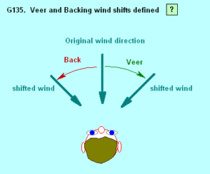 A ‘veering wind’ jelentése: a szél az óramutató járásával megegyező irányú eltolódása.